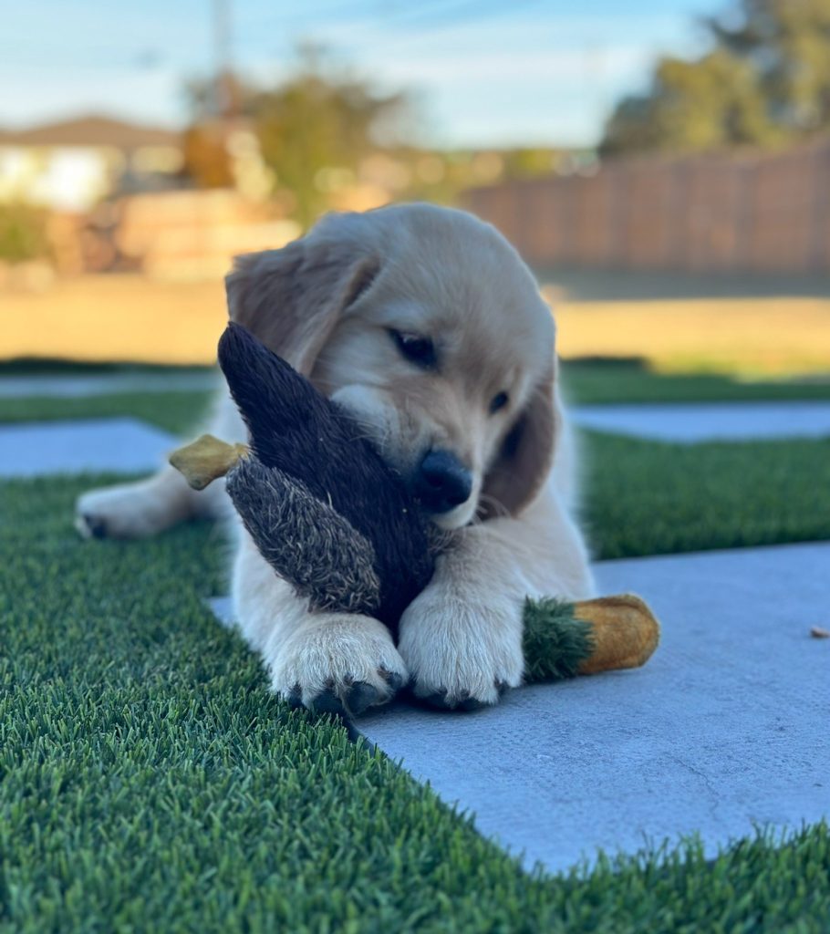 “We are so happy and amazed at our Golden puppy. Winston is so loving, smart, and beautiful. The training Kate does from the time of birth really makes a difference. The love and attention she pours into each of her puppies is evident in the calm and confident puppies she produces. Their demeanor is a testament of her love and dedication. We have never had a dog that is so well-behaved, smart and attentive to commands. He loves his crate and does excellent with potty training. He is an excellent learner. He loves his toys, retrieving and has a very soft mouth. His coat is beautiful. He sheds very little and his body structure is strong. He also loves his bath and grooming time. He has the absolute perfect temperament. He is agile, smart, curious, confident and chill. Kate is a fabulous communicator during the process. She sent videos, updates and advice throughout the process and was easily accessible if we had questions while acclimating our new pup to our home. I highly recommend Kate if you are interested in a quality Golden Retriever. You will be so pleased with the beautiful physique, level of intelligence and the how very loving the puppies are.” -Scott and Kristi T.