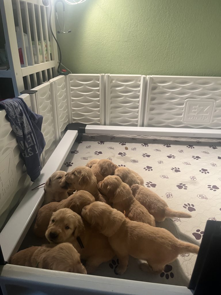 Welcome to the world sweet babies! The puppies have either been delivered via c-section or made it through the birth canal. Mama and myself have been waiting for this moment and its time to transition the puppies from being kept alive inside mama to acclimating to the outside world. Pups are weighed in, checked for cleft palate, rear ends, and heart murmurs. Pups begin to get their sustenance through the mama’s Colostrum and must be kept warm. This is achieved from her external body heat, their siblings in the form of a puppy pile, and carefully placed heat lamps. These first 72 hours are critical. I have a camera and thermometer inside the whelping box to be sure the temperature is just right. I have an app on my phone where I can see them and be alerted if there is a change in temperature. Most puppies that have something wrong will not make it through the third day. Unfortunately, this does happen from time to time and we have to just move on. In the case of a stillborn or a death within the 72-hour period, I let mama see what happened so she can grieve and let go.( You would be surprised how mama knows and needs this closure.) Each puppy has been cushioned in a sac of amniotic fluid and has been fed through an umbilical cord. Once they are out the cord is cut and they are cleaned up quickly. Pups are assigned a colored collar in order to keep up with their progress and health. The first day is usually a very long and hard day for both mama and I. My only goal for the next 72 hours is to keep the whelping box sanitary, provide Mama with fresh water and small nutritious meals several times to help her regain her strength, and monitor the puppies 24/7 for any sign of distress. I use the professional series of whelping boxes from EZ Whelp which has the guard rails which are set up for the first 21 days to reduce the risk of pups being smothered or crushed.