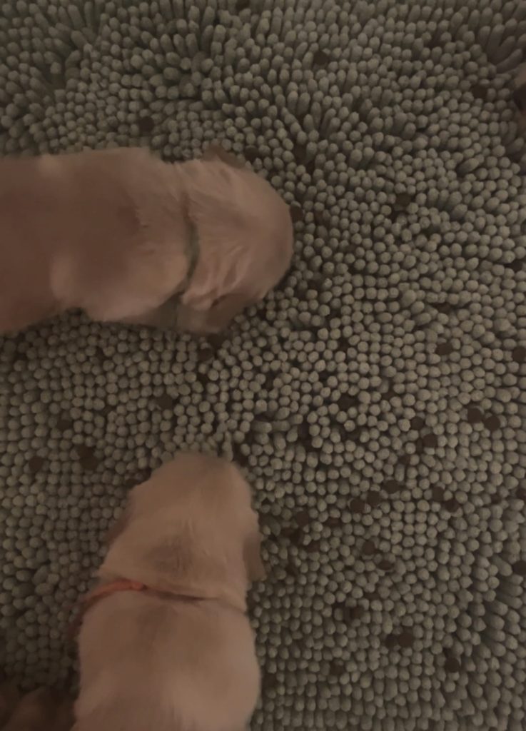 Continue Advanced ENS, ESI and Exposure therapy. Puppy Kibble Intro. I will put very small pieces of kibble into snuffle mats and place around the box to encourage foraging and tracking of food. Afterward, I will put a shallow cookie sheet in the box for their very first drink of water. The pig rails that have been in the box to protect the puppies from accidental crushing or smothering by mama have been removed to give the pups a little more space since they are very vocal and strong enough to pull themselves to safety if mama accidentally lays on someone.