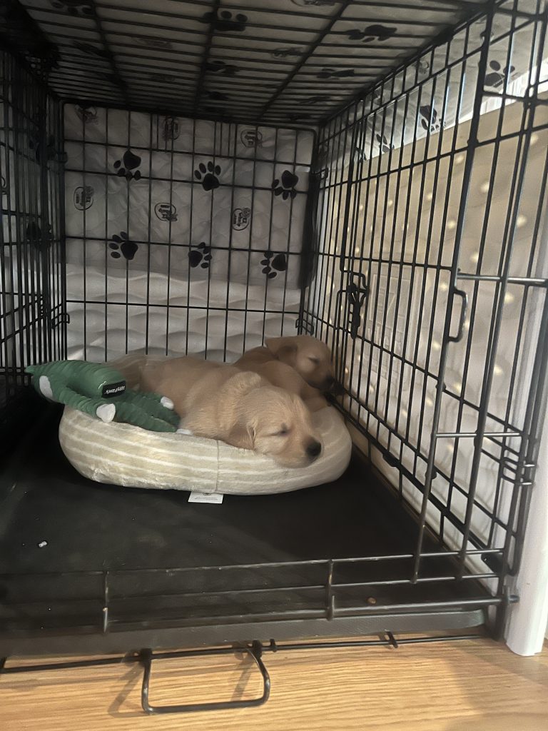 Puppy training begins. Using a clicker or marker word paired with desired behaviors will set a firm foundation of good manners for a lifetime. Puppy parents will continue training with same commands and marker words for best results. First command is “sit.” Hovering hand over puppy head and asking for a polite sit in order to be pet. Playing calm classical music helps stabilize neural development.