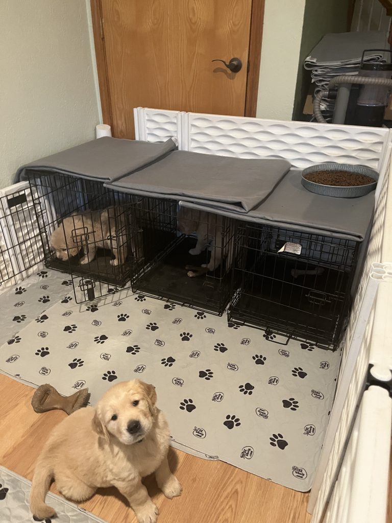 Crate training is an essential piece of the potty training puzzle. The crate needs to be just a little bigger than them. Puppies normally do not like to soil (pee pee or poo poo) in the area that they are in. Your new baby can only hold their urine for 90 minutes to an hour at 8 weeks old. Each week, their bladders get a little bigger giving you more time between potty breaks. As they continue to grow, account for 1 hour per month old that they can hold it.